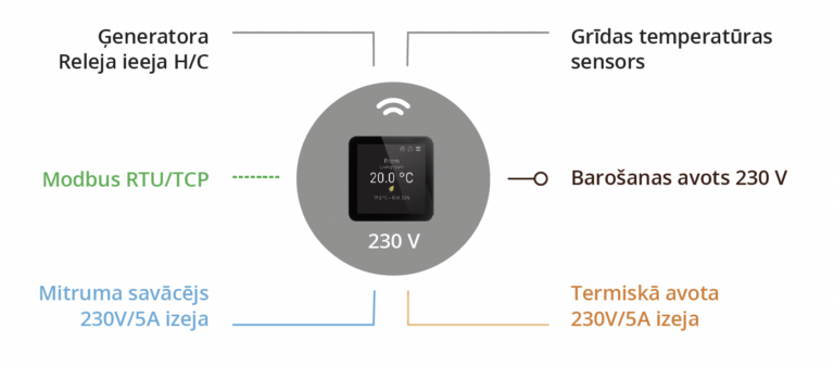 - Temperatūras, mitruma un gaisa kvalitātes sensors, pēc izvēles grīdas vai gaisa kondensāta sensors.