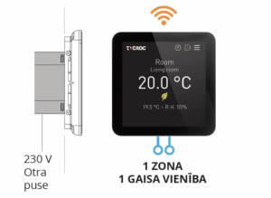 - Divas analogās ieejas un divas digitālās izejas, lai kontrolētu vienas zonas apsildi + dzesēšanu vai pēc izvēles divas apkures zonas.