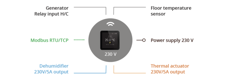 - Two analogue input and two digital outputs to control one zone heating+cooling or optional two heating zones