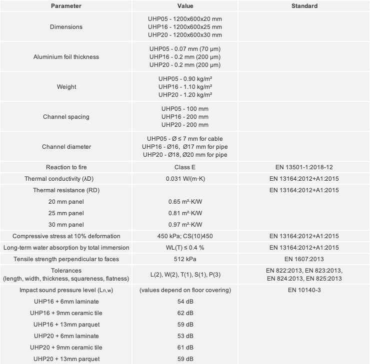 The underfloor heating panel Tycroc UHP has been developed to simplify and accelerate the installation of underfloor heating pipes and cables without using concrete. Tycroc UHP is also suitable to be installed on concrete construction, but as the weight of the square meter of the panel is small, the solution is especially valuable in wooden structures / wooden buildings. The 450 kPa extruded polystyrene foam (XPS foam) panel with grooves specially cut for heating pipes or cables prevents downward heat loss, whilst the 0,2 mm aluminium foil covering the panel is an good heat divider under the flooring.